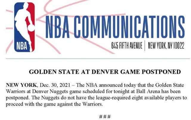 NBA官宣第11场比赛延期!掘金凑不到8人,追梦不满勇士比赛推迟