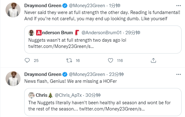 上一场勇士3分惜败掘金,追梦格林因触发健康协议未能出战,虽然格林仍旧无法出战,但他对这一次比赛被延期很不满,格林在网上和球迷吵起来了——有球迷说掘金前几天也没有全力以赴,格林回应从未说过他们全力以赴,如果你不小心,你最终可能会看起来很愚蠢。