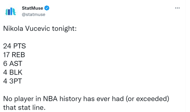 而武切维奇末节爆发独得13分,全场则是19中9三分8中4砍下24分17板6助攻4盖帽,据美媒statmuse统计,武切维奇是NBA历史首位单场打出至少24分17板6助攻4盖帽4记三分的球员!作为一名内线,武切维奇有得分、外线投射、护筐以及策应,可以说是最适合现代NBA的大个子之一!