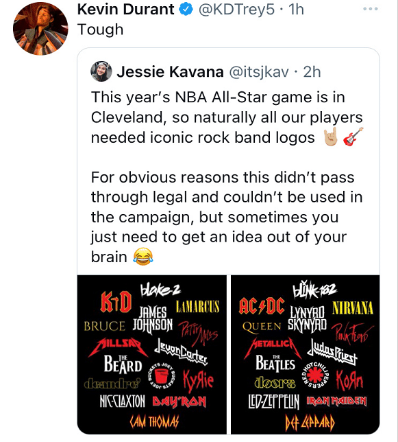 这份别出心裁的设计也获得了杜兰特和篮网老板蔡崇信的手动点赞,很显然他们对于这位女球迷设计的摇滚版篮网全队名字是非常满意的,毕竟这名女球迷肯定是花费了不少的时间才设计出来的,独具匠心。