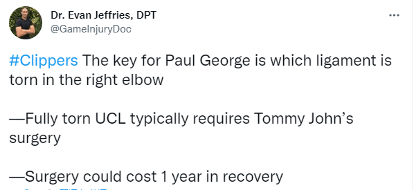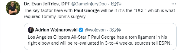 快船官宣!乔治右肘韧带撕裂,医学专家:最严重至少伤停一年