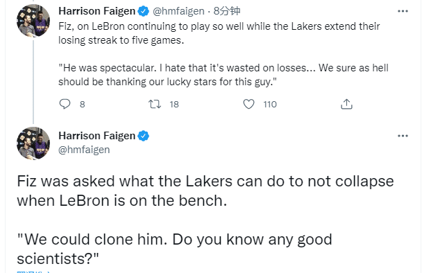赛后,湖人代理主帅菲兹戴尔回应湖人如何解决詹姆斯坐在替补席时球队崩盘的情况,菲帅直言:我们应该克隆詹姆斯,你认识什么优秀的科学家吗?