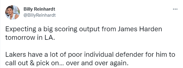 对于哈登单核带队出战,篮网记者Billy Reinhardt发推写道:期待哈登明天在洛杉矶砍高分,湖人队的防守很糟糕,哈登可以一遍又一遍地打爆他们。