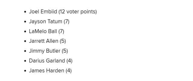 根据投票计分,东部全明星替补是恩比德(12分)、塔图姆(7分)、三球(7分)、贾勒特-阿伦(5分)、吉米-巴特勒(5分)、加兰(4分)、哈登(4分)。