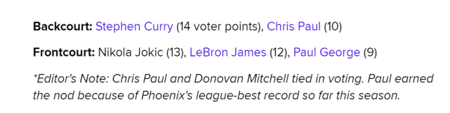 根据投票计分,西部全明星替补是米切尔(10分,注:得分和保罗相同,但太阳成绩更优)、唐斯(8分)、东契奇(7分)、布克(6分)、德雷蒙德-格林(6分)、戈贝尔(6分)和莫兰特(4分)。