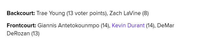 字母哥14分,杜兰特14分,德罗赞13分,杨13分,拉文8分。这意味着东部的杜兰特和字母哥获得了7位专家的全票。6位专家投了杨和德罗赞的首发。拉文只得到8分,依然进入首发,因为东部后场得分没有比他更高的。
