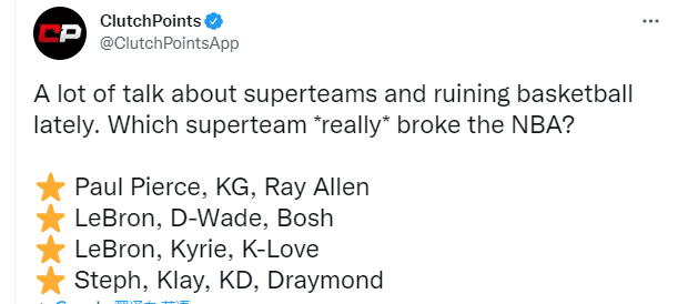 来源:24直播网12-23 13:5624直播网12月23日讯,此前香波特指责詹姆斯不忠诚,加盟热火毁了NBA,如此言论引发巨大拯救;在这样的情况下,美媒ClutchPoints列出四大超级巨头组合,发推写道:最近有很多关于超级球队毁了篮球的讨论,哪个超级球队真的毁了NBA?