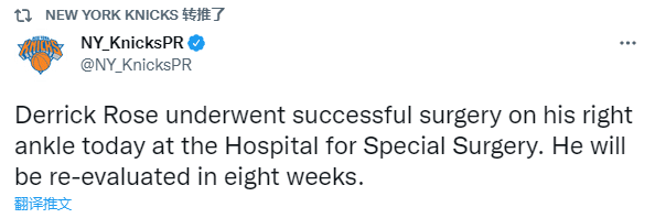 来源:24直播网12-23 13:5324直播网12月23日讯,尼克斯折损一员大将,据名记shams报道,尼克斯球星德里克-罗斯成功接受右脚踝手术,至少伤停8周,之后尼克斯官宣,罗斯预计伤停两个月。