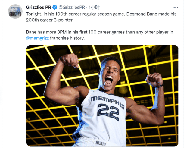 今天这场比赛是贝恩常规赛生涯第100场比赛,在这场比赛之前他已经命中198记三分,而对阵雷霆第一节,贝恩就迅速命中2记外线,生涯三分命中数突破了200个。据灰熊官方统计,贝恩就此成为队史在生涯前100场命中三分数最多的球员!