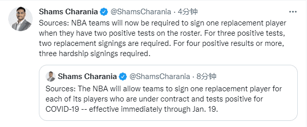 来源:24直播网12-20 21:2324直播网12月20日讯 ,由于联盟疫情全面爆发,针对这样的情况,NBA又出台新规从而防止联盟停赛,据名记shams报道,最初的报道为每一名阳性球员对应一个新名额,但他随后更正为如有两名阳性球员,可获得一个名额;如有三名阳性球员,可获得两个名额;如有四名或更多阳性球员,可获得三个名额,即日起生效至 1月20 日,NBA已经和球员工会达成这样的协议。