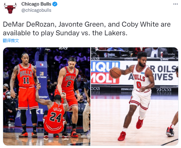 目前公牛17胜10负排在东部第二,在德罗赞、拉文等核心球员隔离期间,公牛向联盟申请并且获准延期了两场比赛,因为公牛队已经长达一周没有打比赛了,而明天对阵湖人,恐怕德罗赞就像憋坏了似的,有可能开启疯狂的进攻模式。