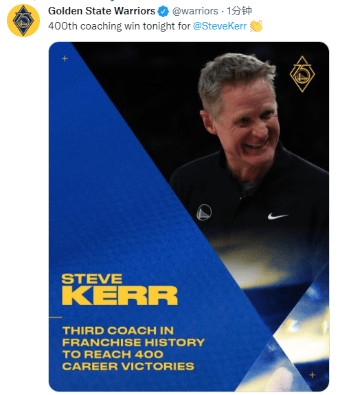 库里拿到30分带队赢球创纪录,勇士主帅科尔也迎来里程碑,拿到执教生涯第400场胜利,成为勇士队史第三位达成如此成就的主教练;勇士官方第一时间晒照恭喜科尔。