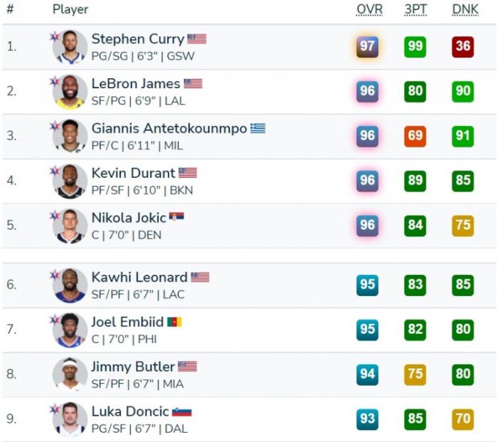 其中篮网队明星后卫詹姆斯-哈登在这次更新中,能力值再次下降,总评分如今已经来到了89,威少,保罗,比尔等明星球员也被扣除了一点能力值,其中威少的总评已经来到了82分,接近角色球员和明星球员的边缘,库里尽管近期手感不佳,评分依旧是97独占第一,詹姆斯,字母哥,杜兰特和约基奇评分96并列第二名。