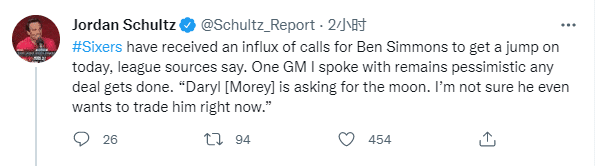 记者Jordan Schultz报道,一位和他交谈过的总经理对76人送走西蒙斯持悲观态度,他透露:76人已经收到了很多关于西蒙斯交易的电话,一位和我交谈过的总经理对他们关于本的任何交易都持悲观态度,“他们想要月亮,我不确定他们现在是不是想交易他。