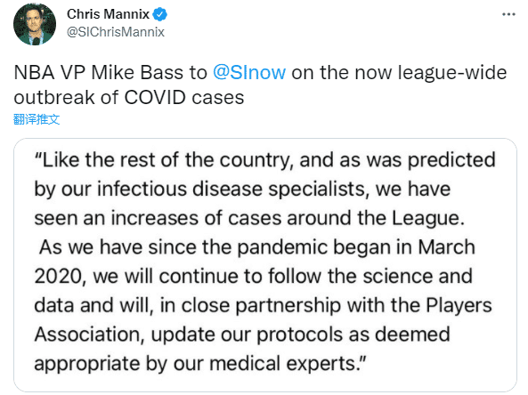 对于联盟的现状,NBA发言人迈克-巴斯表示:与全国其他地区一样,正如我们的传染病专家所预测得那样,自2020年3月疫情开始以来,我们已经看到联盟各地的病例有所增加。我们将继续关注科学和数据,并将与球员工会密切合作。