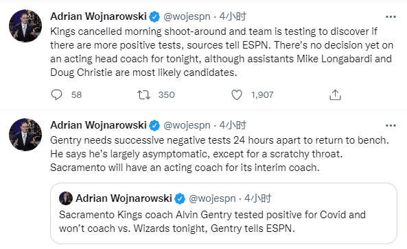 不久前,国王67岁主帅阿尔文-金特里新冠检测阳性,不会执教今天球队与奇才的比赛,国王紧急取消了投篮训练;此前步行者主帅卡莱尔也查出阳性,猛龙总裁乌杰里也不幸中招。
