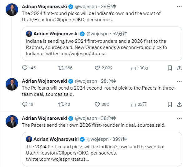 据名记Woj报道,消步行者、猛龙与鹈鹕将达成三方交易,具体的交易详情——