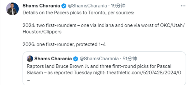据后续报道,步行者送出的选秀权分别为2024年首轮(步行者)、2024年首轮(爵士/火箭/快船/雷霆中最差)与2026年前四保护首轮(步行者)。