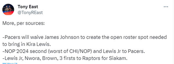据步行者随队记者Tony East跟进报道,在该笔三方交易中,小刘易斯先被送至步行者,再被送至猛龙。步行者为交易达成将裁掉詹姆斯-约翰逊,以腾出阵容名额。消息人士透露,如约翰逊在裁员澄清期内未被认领,步行者计划再次与他签约。
