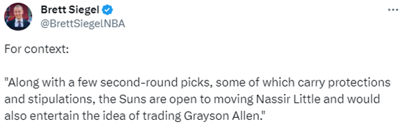 BR名记Jake Fischer报道,太阳被认为是交易市场中最活跃的球队之一,他们希望围绕杜兰特、布克、比尔三巨头升级轮换阵容,他们已在探索打包格雷森-阿伦和利特尔能得到什么回报。