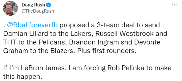 湖人把威少和霍顿-塔克送到鹈鹕,得到利拉德;开拓者把利拉德送到湖人,得到英格拉姆、格拉汉姆、萨托兰斯基和2023年首轮选秀权;鹈鹕得到威少、霍顿-塔克、利特尔和2027年首轮选秀权。
