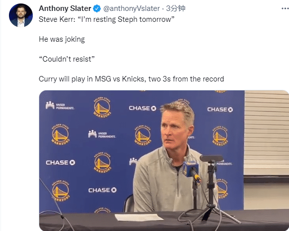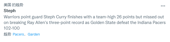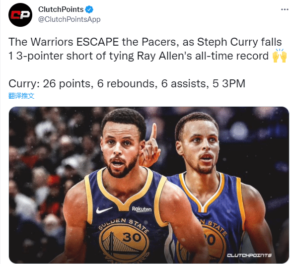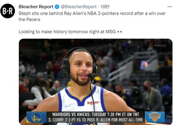 美媒ClutchPoints发推写道库里距离追平雷阿伦仅差一记三分;露天看台晒出勇士下一场与尼克斯的时间表,配文写道:在赢得步行者之后,库里仍旧在三分榜上落后雷阿伦,希望他明天在麦迪逊花园球馆创造历史。