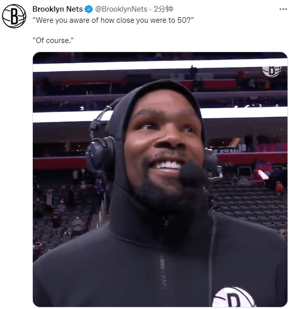 记者问杜兰特是否知道自己得分接近50分,杜兰特直接回应:当然了。