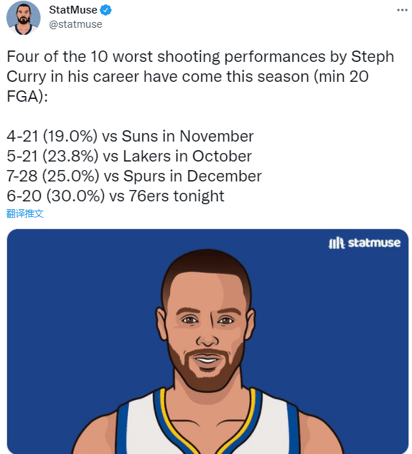 据美媒StatMuse统计,在库里至少出手20次投篮的十大最差投篮比赛中,本赛季有4次上榜——11月对阵太阳21投5中,命中率19%;10月对阵湖人21投5中,命中率23.8%;12月对阵马刺28投7中,命中率25%;今天对阵76人,20投6中,命中率30%。