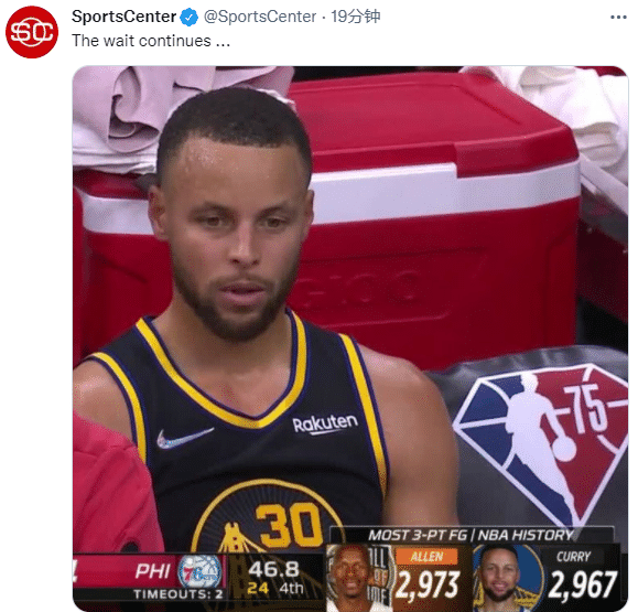 勇士不敌76人,由于比赛早早失去悬念,库里提前下场;终场前46.8秒,镜头给到库里,一脸沮丧很落寞;美媒SpointCenters晒出库里沮丧表情,配文写道:继续等待。