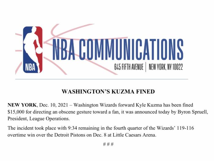 NBA罚单!库兹马朝球迷竖中指被罚1.5万,灰熊悍将被罚2.5万