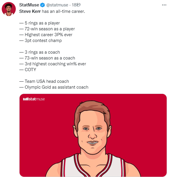 美媒StatMuse列出科尔的履历——作为球员时,科尔拿过5次总冠军、单赛季72胜以及三分王;作为NBA教练时,科尔带队夺得3次总冠军、单赛季73胜以及年度最佳主帅;现在成为美国男篮下一任主帅,作为助教拿过一次奥运金牌。