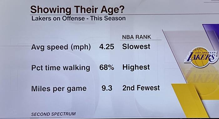 据ESPN统计,赛季至今湖人队的平均速度是联盟最慢(每小时4.25英里);比赛时在场上走路时间占全部比赛时间的比例为68%,联盟最高,场均跑动距离(9.3英里)是联盟第二少。