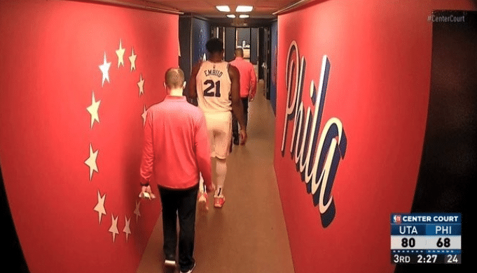 第三节比赛还有2分27秒,恩比德就返回更衣室了,费城记者Rich Hofmann报道恩比德在打出疯狂首节的表现时候,他就一直不停地抓自己的胸腔,显然那时候恩比德的身体就有问题了,最终确定恩比德是因为右侧腹痛返回更衣室临时处理,尽管随后返回比赛,但伤病的折磨还是让恩比德的状态下滑。