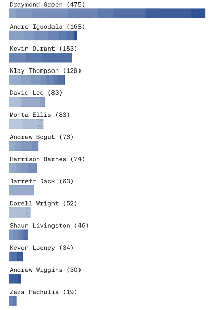 杜兰特的153次和克莱的129次排名第三和第四名,联想到杜兰特与库里合作的时间不长,克莱因伤缺席的时间很长,所以能够有这样的数据,排名给库里助攻三分球榜单前列,还是说明了在球场上搭档的时候,他们还是经常给库里助攻的。大卫-李等人排在后面。
