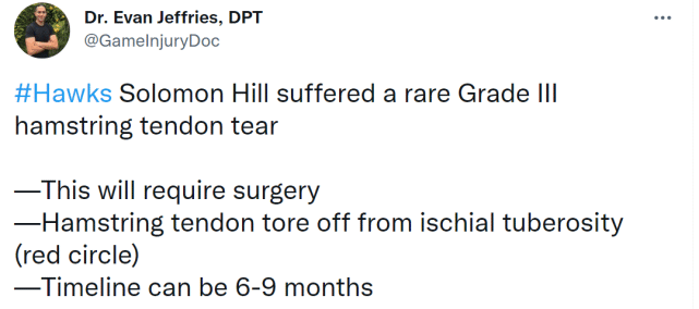 所罗门-希尔在对黄蜂一战中受伤。医学专家Evan Jeffries提到希尔的伤情时写道:“所罗门-希尔遭遇了一次罕见的腿筋肌腱三级撕裂,这需要手术治疗,腿筋肌腱从坐骨结节处撕裂,康复期可能是6-9个月。”