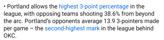 官网晒出了一项关键数据,那就是勇士今日的对手开拓者,恰恰是联盟目前防守三分能力最差的球队。赛季至今,开拓者对手的三分命中率高达38.6%,是联盟最高,另外,开拓者场均让对手命中13.9个三分球,也是联盟第二差的表现,仅好于雷霆。