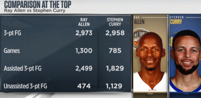 前方还给出了阿伦和库里的三分数据对比。阿伦用了1300场比赛投中2973个三分,而库里只用了785场比赛投中2958个三分。阿伦的受助攻三分是2499个,库里的受助攻三分是1829个,阿伦的非受助攻三分是474个,库里的非受助攻三分是1129个。