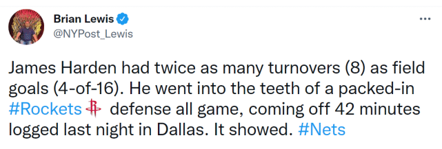 是的,全场失误8次,却只进了4个球,哈登的低迷有目共睹。赛后,哈登接受采访时感慨道:“我得到了自己想要的出手机会,但就是投不中。” 他还谈到此前在火箭效力的感受时:“非常特别。无论场上还是场下,我都在这里度过了生涯中最惊艳的时光。”