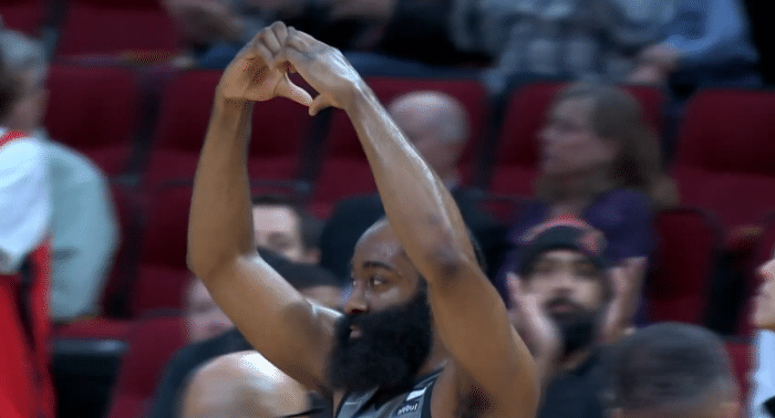 不过火箭又在主场为哈登播放致敬视频,火箭在球馆大屏幕上播放哈登昔日集锦以及其他暖心画面,此时火箭主场响起欢呼声,哈登站起来高举双手并且双手比心,把手放在胸口表达对球迷的爱。