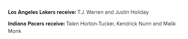 来源:24直播网12-08 11:1524直播网12月08日讯 ,知名美媒Bleacher Report(B/R)提到了四支开局令人失望的球队,包括湖人、开拓者、步行者和76人。他们为这四支球队分别建议了一笔交易方案,认为这样的交易能够拯救他们,解决球队的问题。关于湖人,他们提出的方案是3换2:用霍顿-塔克、纳恩和蒙克去换步行者的TJ-沃伦和贾斯汀-霍乐迪。