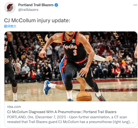 开拓者官宣30岁麦科勒姆患气胸怪病!专家解析平均缺席6.5场