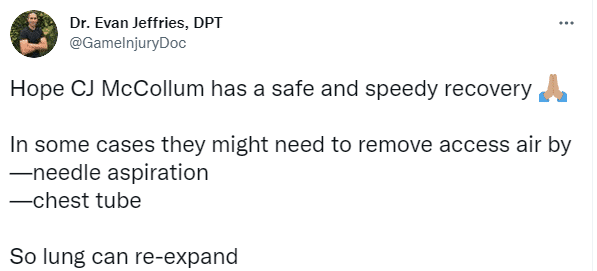 另一医学专家Evan Jeffries发推写道,希望麦科勒姆早日康复,他需要进行针吸和胸管治疗。