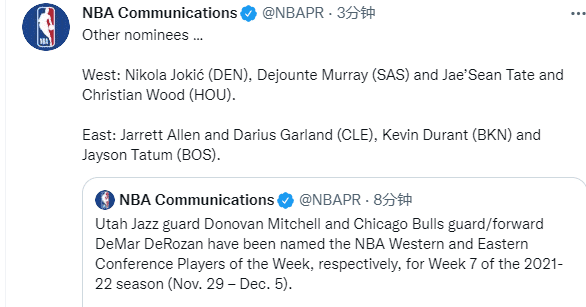 米切尔本赛季首次获得西部周最佳,生涯第3次获得此奖项;爵士官方第一时间恭喜米切尔。
