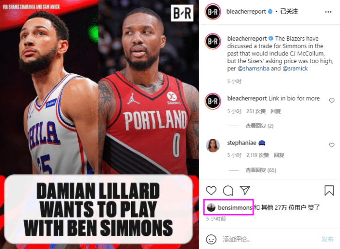 名记报道利拉德想要联手西蒙斯,而西蒙斯本人点赞这则报道,很明显,西蒙斯也想和利拉德一起打球。