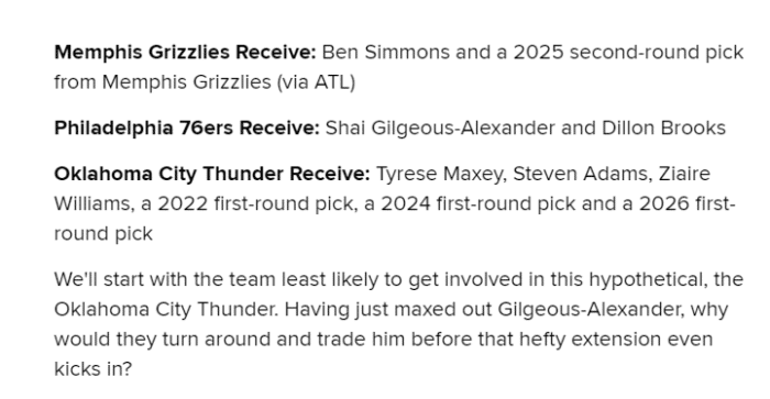 美媒露天看台还列出了关于的西蒙斯的交易方案,76人、雷霆和灰熊三方交易——76人得到亚历山大、狄龙-布鲁克斯;灰熊得到西蒙斯和2025年次轮选秀权;雷霆得到马克西、亚当斯、宰伊尔-威廉姆斯和三个首轮选秀权。