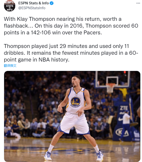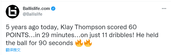 美媒Ballislifeye也晒出昔日集锦,发推:5年前的今天,克莱-汤普森狂砍60分,在29分钟内,仅仅运球11次,他持球时间只有90秒。