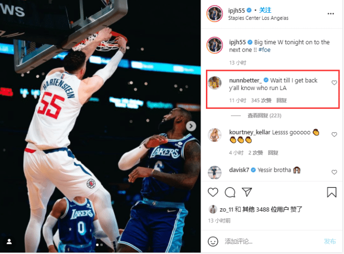 纳恩在评论区回应:等我回来,你们就知道谁主宰LA了。