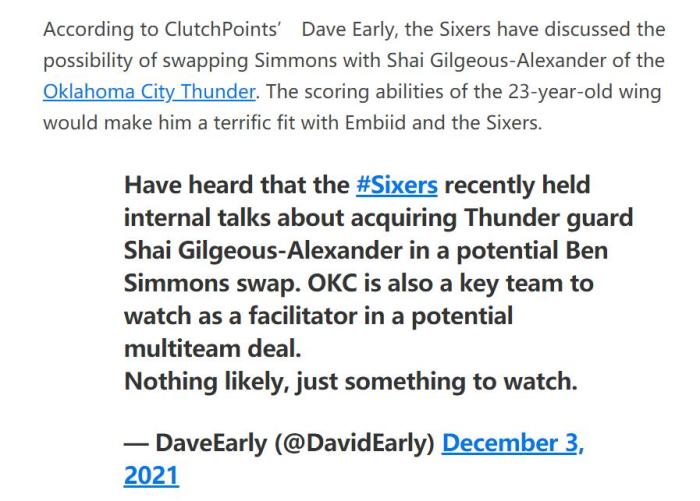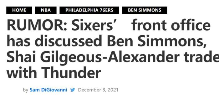 记者厄利报道:“据悉,最近费城和雷霆商谈用西蒙斯换来亚历山大,同时,雷霆也是被认为潜在的的多方交易的关键一环。目前一切还在观望中。”由于亚历山大目前处于新秀合同的最后一年,虽然他已经签订5年1.7亿的提前续约合同,但本赛季的薪水只有549万美元,和西蒙斯的3159万美元相差巨大,所以需要配平或拉入其他球队。