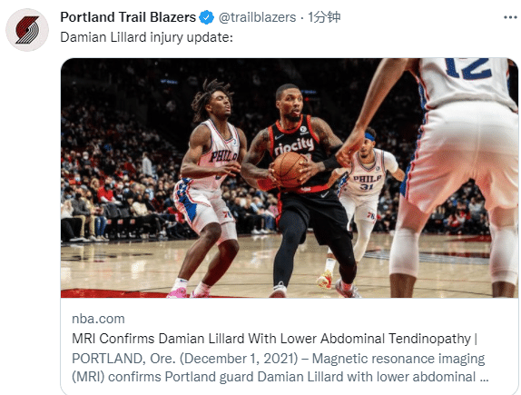 开拓者官宣连伤两人!利拉德核磁结果出炉,腹部肌腱受伤至少伤停10天