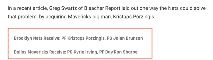 于是美国知名体育媒体《FW》建议篮网打包送出欧文和夏普,从独行侠换来波尔津吉斯以及布伦森。